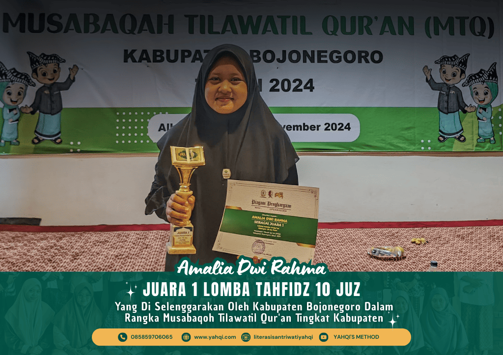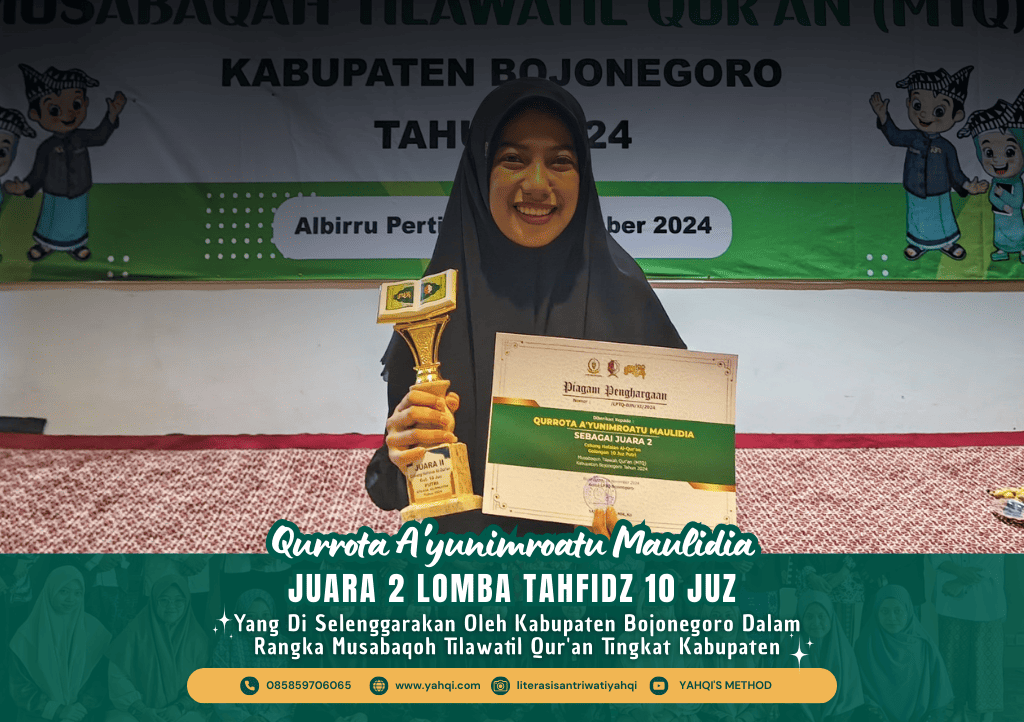 Tiga santri YAHQI, Ukhti Neza, Ukhti Amel, dan Ukhti Syifa, berhasil menorehkan prestasi membanggakan dengan meraih juara dalam lomba Syarhil Qur’an tingkat Kabupaten MTQ 2022.